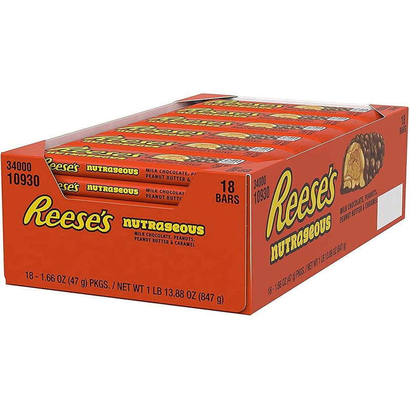 Durch und durch erdnussig. Reese's NutRageous ist der Riegel, bei dem sich alles um die Erdnuss dreht. Zarte Erdnusscreme ist hier umhüllt von einer Karamellschicht, ganzen Erdnüssen und köstlicher Milchschokolade. Entdecken Sie den knackig-cremigen Genuss und lassen Sie sich diesen Riegel Stück für Stück auf der Zunge zergehen.